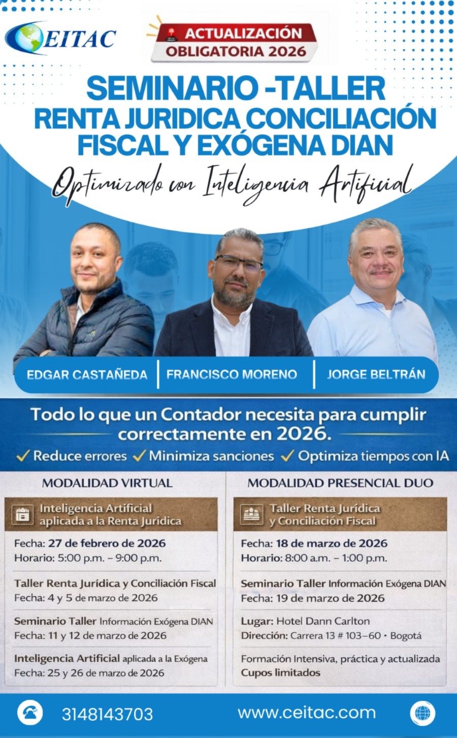 CEITAC SAS es una organización líder dedicada a la formación integral, con especialización en las áreas contable, tributaria y laboral. Nos diferenciamos por ofrecer programas prácticos y permanentemente actualizados, diseñados para facilitar el cumplimiento normativo y fortalecer la toma de decisiones estratégicas. Contamos con los mejores conferencistas a nivel nacional y alianzas estratégicas que garantizan soluciones educativas de alto valor para profesionales y empresas.